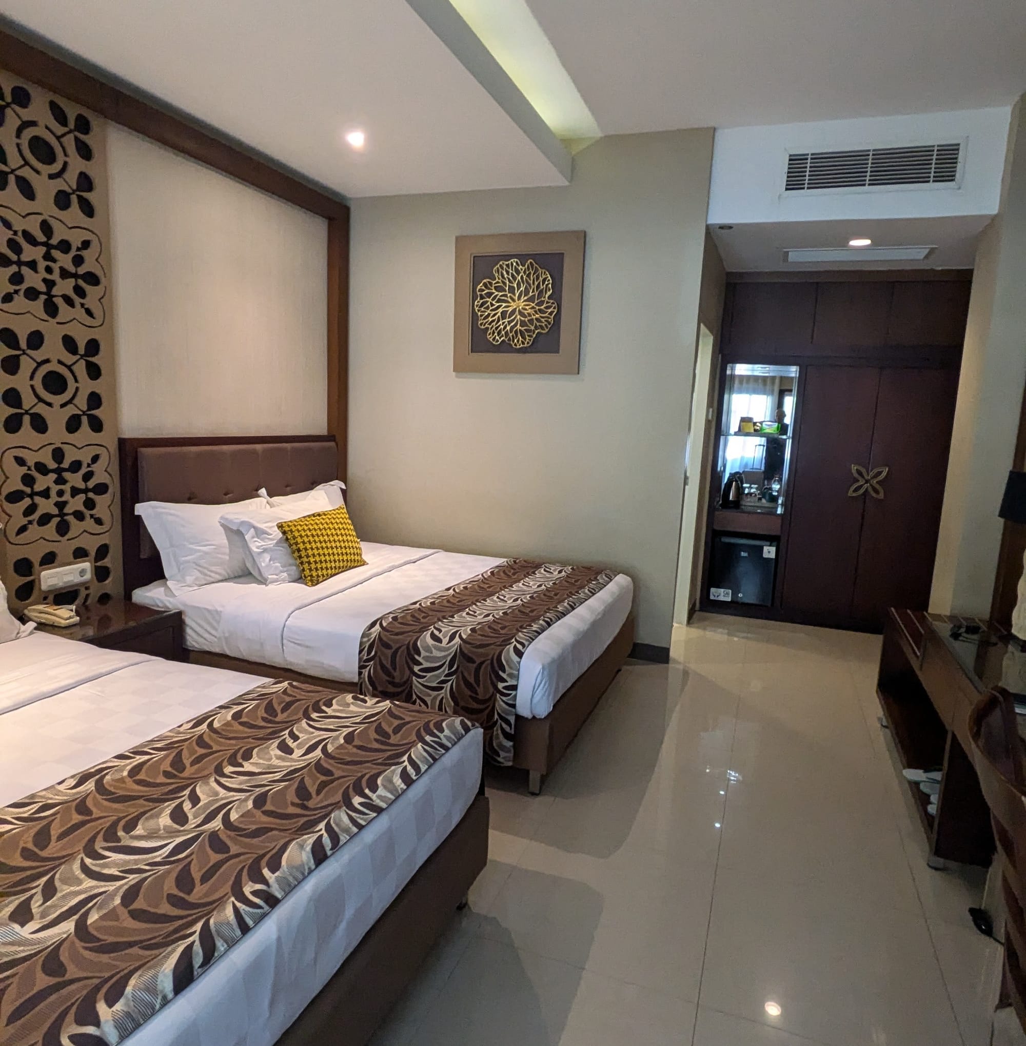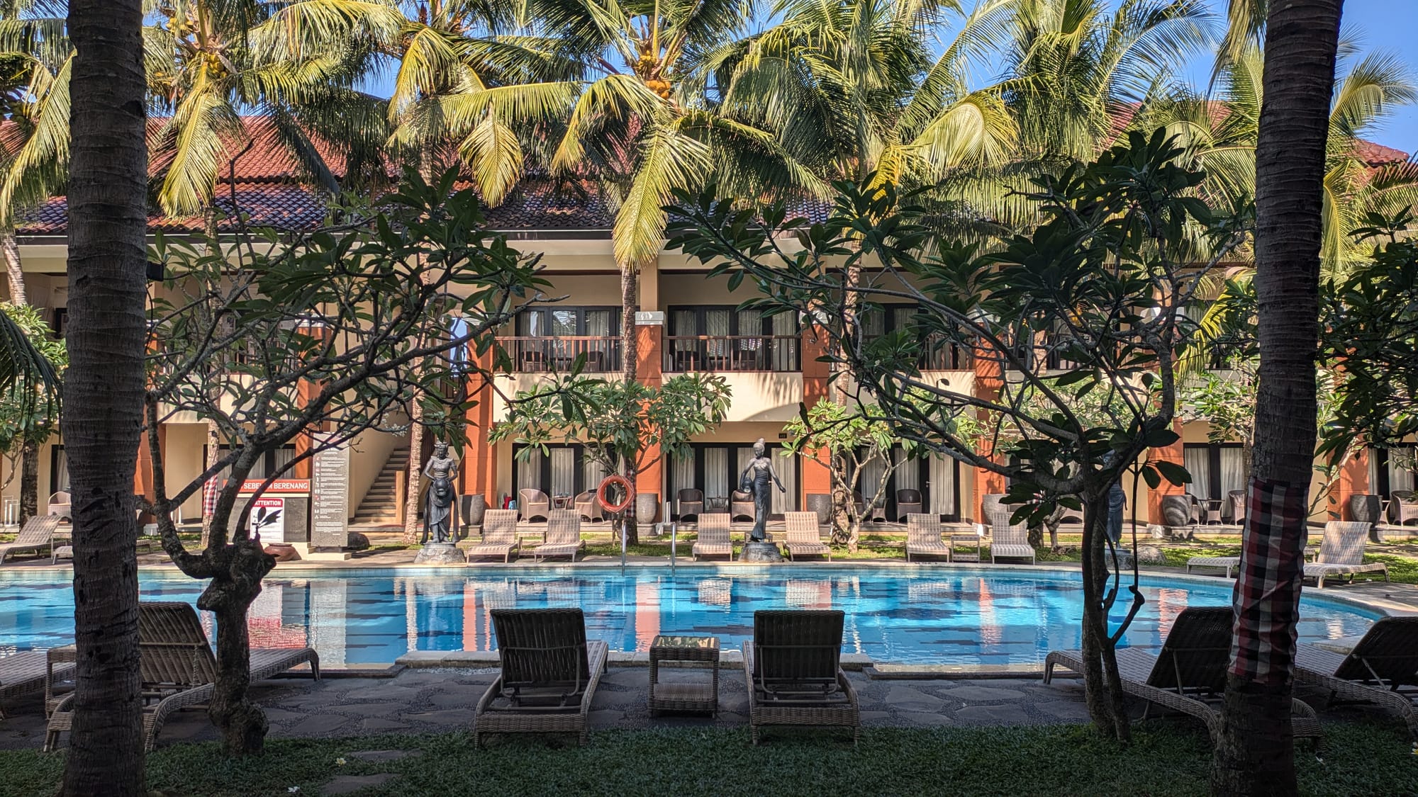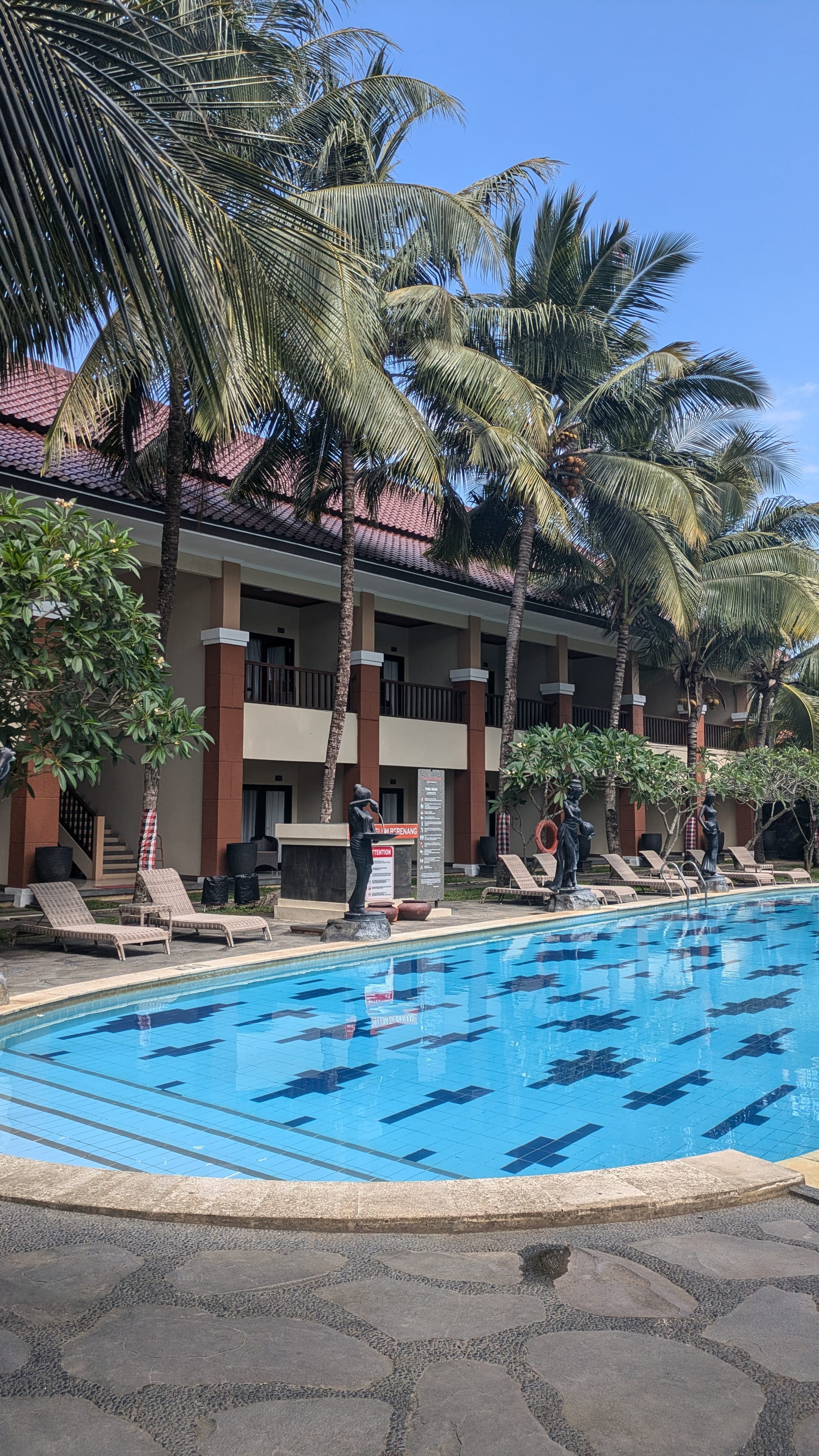 Een luxe hotel met een fraai zwembad. Het hotel ziet er prachtig uit, de kamers zijn mooi en ruim. Onze badkamer was echter wel aan renovatie toe. Weinig waterdruk, lastig op warmte te krijgen en hier en daar schimmelvorming of slecht herstel daarvan. Het ontbijt is in buffetvorm waarbij het met name westers is met een klein beetje Indonesisch. Het is wel smakelijk, maar niet heel bijzonder.